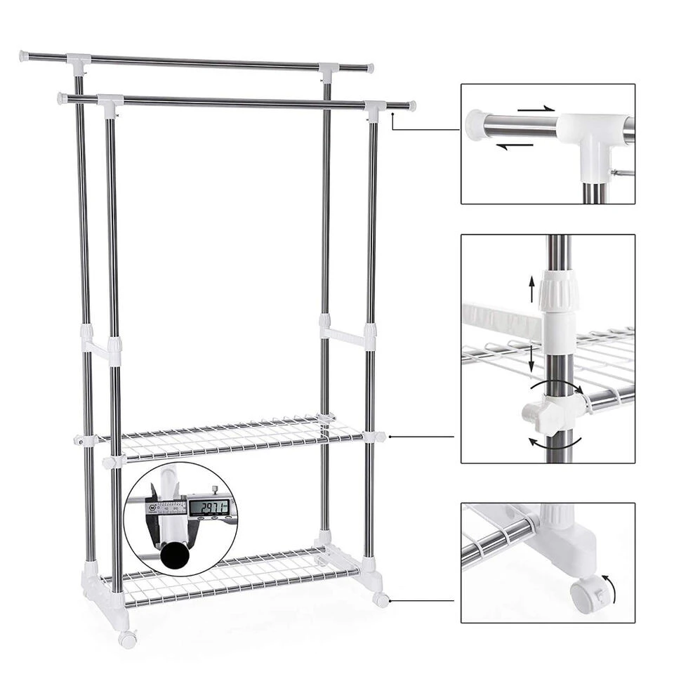 De echte modebewuste vrouw of man heeft aan de traditionele kledingkast vaak niet genoeg. Deze barst als het ware van de kledingstukken, met als extra nadeel het verlies aan overzicht. Kies daarom voor dit dubbel kledingrek waar plaats is voor allerlei outfits, inclusief schoenen!