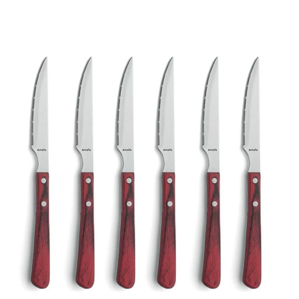 Deze traditionele set bestaat uit zes scherpe 13/0 hoogwaardige roestvrijstalen steakmessen met pakkahout halve lemmet-heften en 2 klinknagels. Bovendien is deze set vaatwasmachinebestendig en biedt het gebruikte chroomnikkelstaal met micro-gekartelde randen een hoge corrosieweerstand.