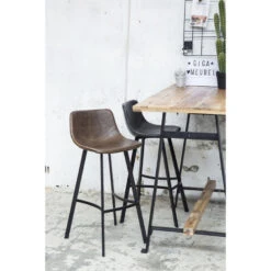 Deze stoere barkruk is een echte eyecatcher in huis en staat mooi bij een donkere of houten bartafel. Het stalen frame is een goede combinatie met het robuuste kunstleer, wat zorgt voor een stoere vintage look. Er zijn twee opties, namelijk de barkruk (zithoogt 73cm) en de barstoel (zithoogte 63cm). Verkrijgbaar in de kleuren donkerbruin, zwart en cognac.