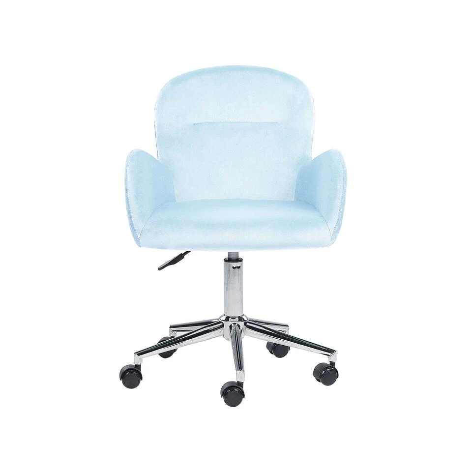 Gestoffeerde stoel met armleuningen. Upgrade de uitstraling van je kantoorruimte door er een comfortabele fauteuil met een gezellige uitstraling aan toe te voegen. De brede en dik gecapitonneerde zitting is bekleed met fluwelen stof in een prachtige kleur die mooi overeenkomt met de retro-geïnspireerde vorm van het meubel. Het duurzame metalen onderstel garandeert stabiliteit en dankzij de ingebouwde wielen en de gasveer kun je het meubel gemakkelijk aanpassen aan je behoeften.