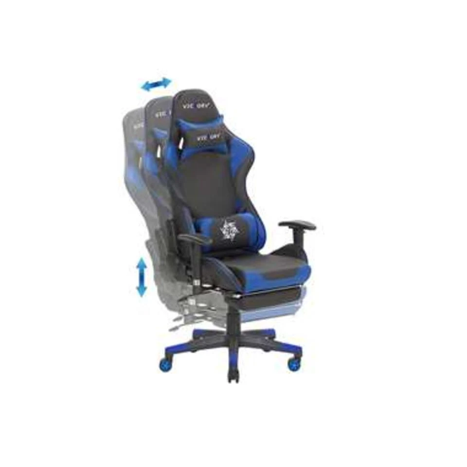 Moderne gaming bureaustoel in zwart en blauw. De perfecte stoel voor lange gaming-sessies, deze bureaustoel met kunstleren bekleding benadrukt een ontwerp dat langdurig comfort garandeert. Met de talrijke mogelijkheden voor hoogte- en armleuningaanpassingen kun je het verstellen aan jouw lichaamsbehoeften. De zitting van de stoel is voorzien van memory foam dat zich vormt naar de contouren van je lichaam, drukpunten vermindert en een superieur comfort biedt. Extra kussens in de nek- en lendenstreek bieden verlichting voor de wervelkolom, en dankzij een uitschuifbare voetensteun kun je je benen volledig strekken.