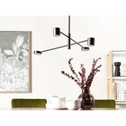 Moderne hanglamp voor woonkamer. Met deze hanglamp breng je een industrieel accent in je kamer. Het beschikt over 4 lampen in twee verschillende maten, elk aan het uiteinde van slanke lamparmen. De geïntegreerde led-lampen geven warm wit licht dat perfect is om je woonkamer of eetkamer op te fleuren.