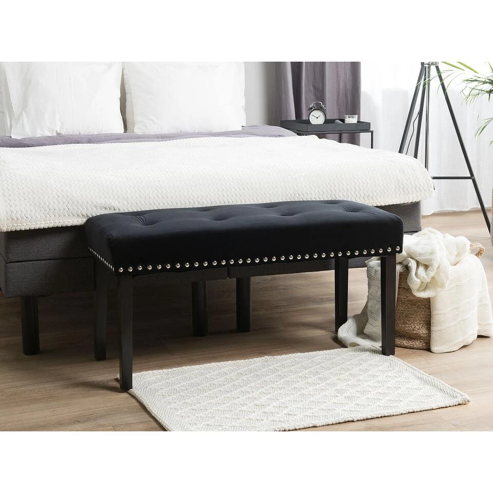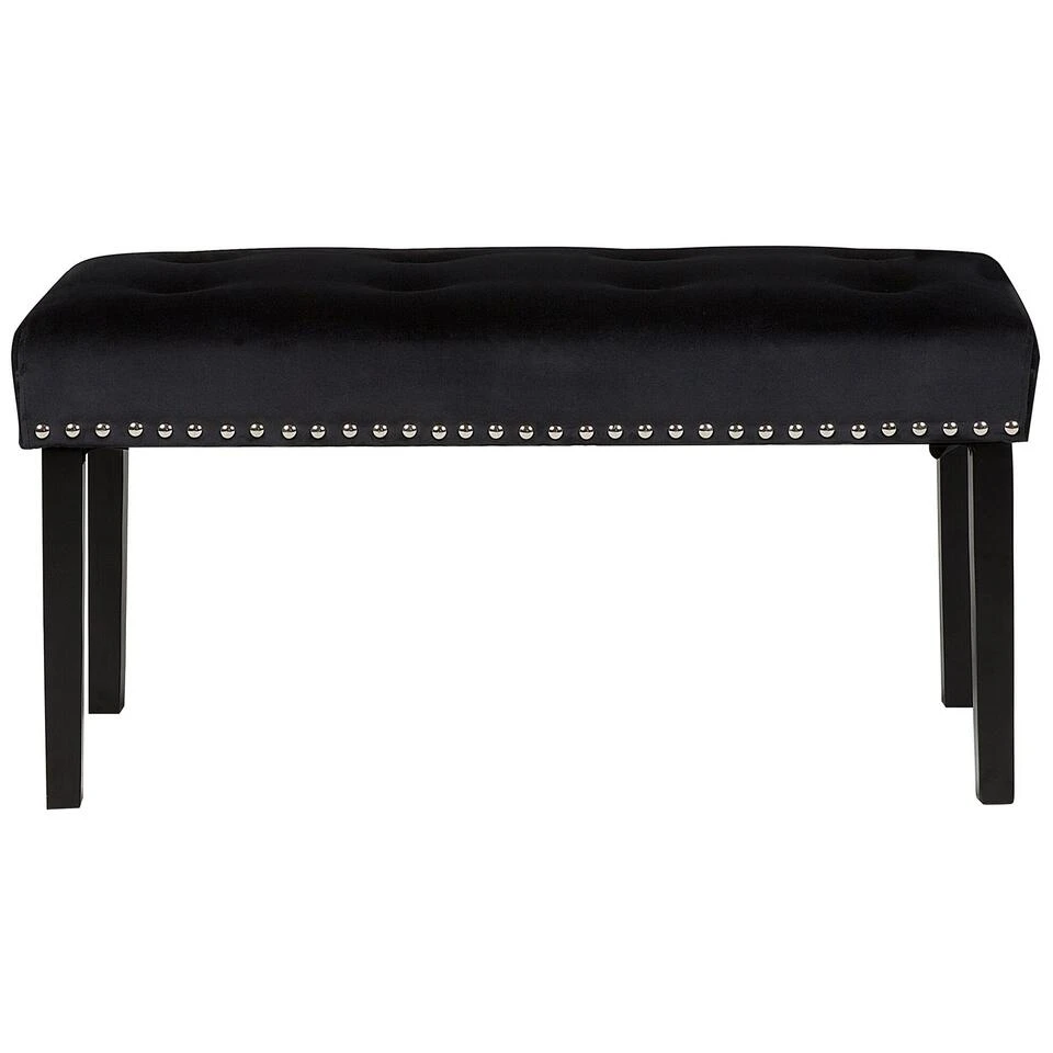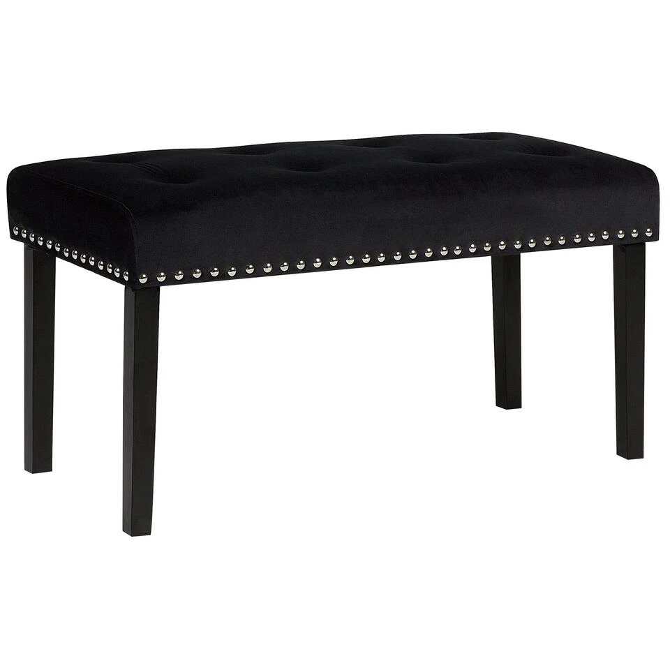 Elegante bank in het zwart met metalen klinknagels. Dit stijlvolle fluwelen bankje past in jouw eetkamer, slaapkamer of woonkamer. Het is zeer comfortabel dankzij de voering van zacht schuim. Het bijzondere van dit meubelstuk is de versiering met klinknagels van metaal, waardoor het bankje er erg stijlvol uitziet.