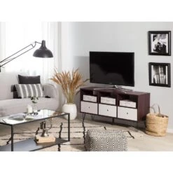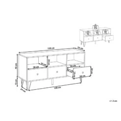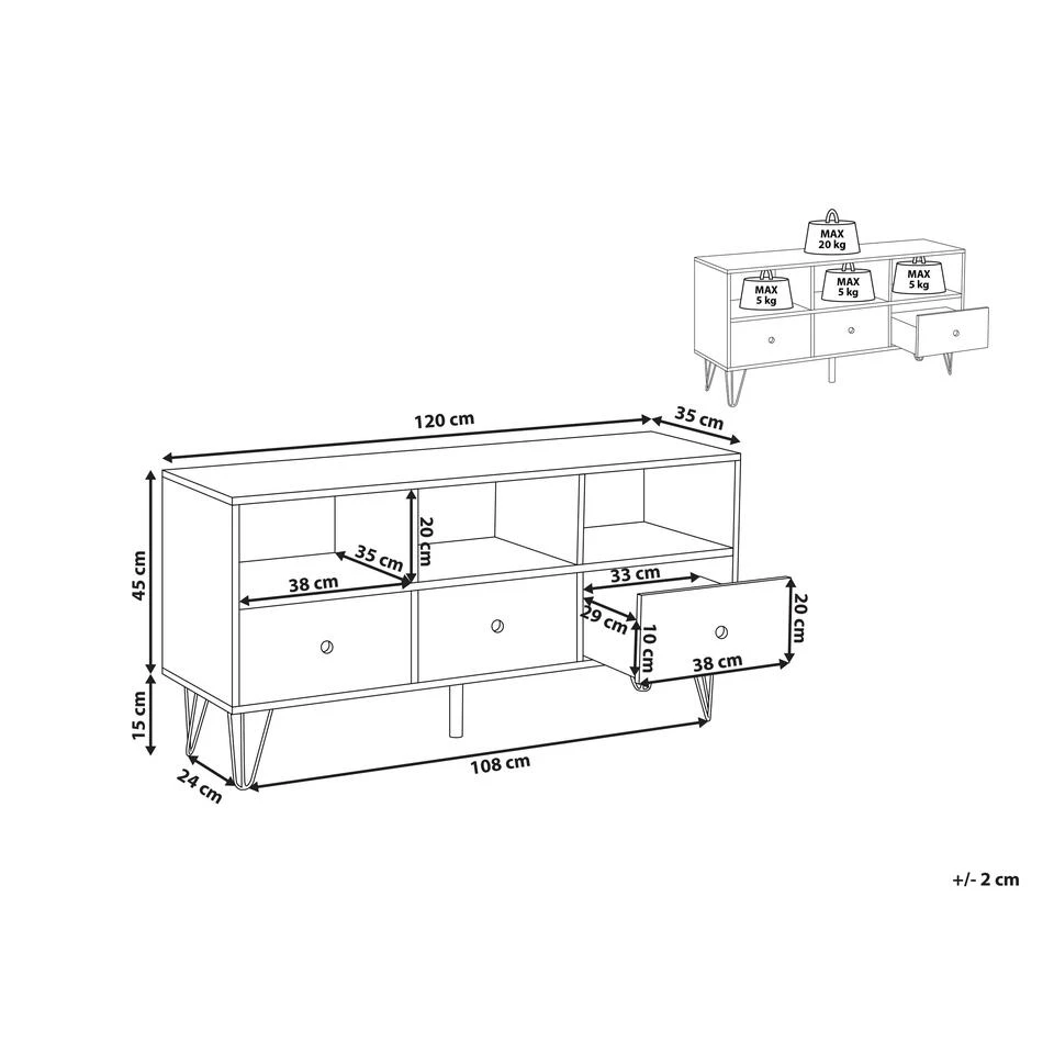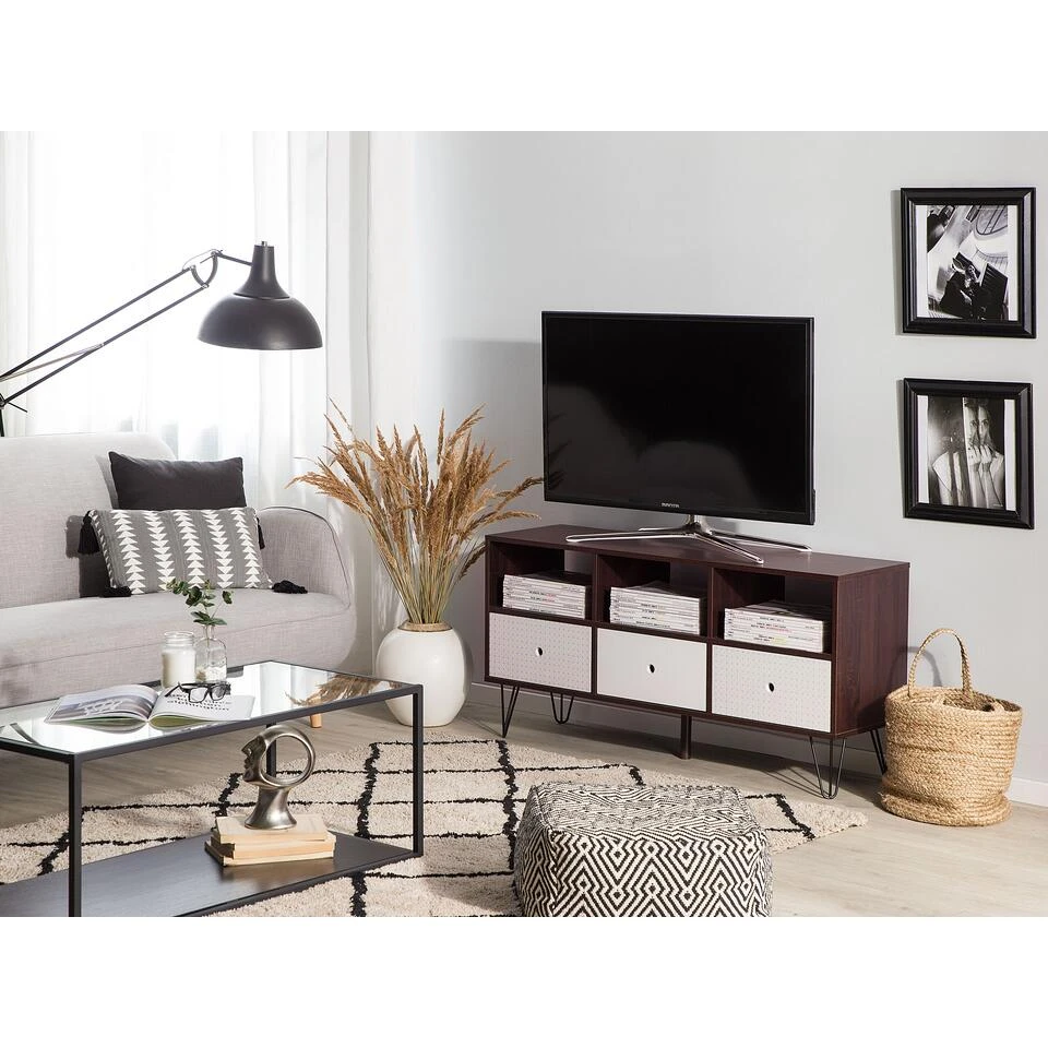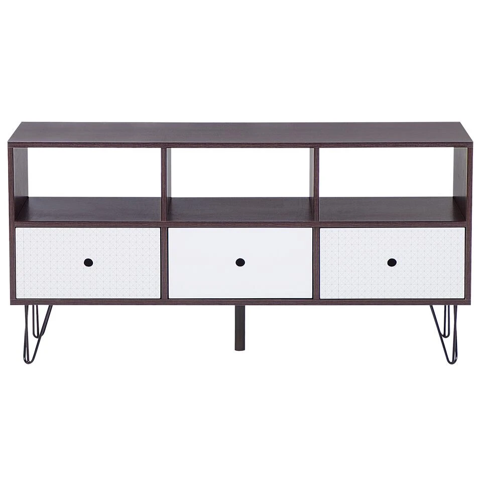 Modern tv meubel met 3 laden in retrostijl. Een kast met veel opties! Het is gemaakt van stevige MDF-platen ondersteund door massieve metalen poten, en daarom de perfecte plaats voor je tv. De ruime, brede planken en laden bieden royale ruimte voor het opslaan van verschillende items, zoals dvd’s, cd’s of game-consoles. Dankzij zijn robuuste afwerking en klassieke stijl is de kast ook ideaal als decoratief dressoir of als hal kast.