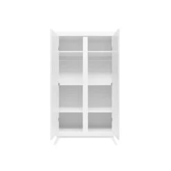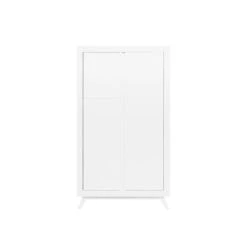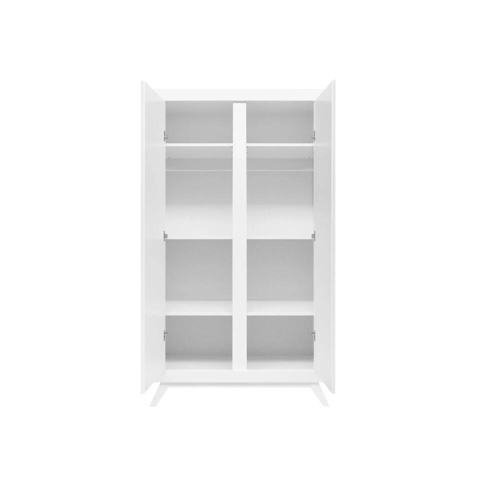 Deze ruime kledingkast Anne van Bopita is geheel in wit uitgevoerd en staat op schuingeplaatste, taps toelopende poten. Hierdoor heeft deze garderobe een retro-look. De deuren zijn uit dik MDF vervaardigd en zijn voorzien van subtiele horizontale groeven. De gebruikte lak is op waterbasis, en daardoor veilig voor kinderen en milieuvriendelijk. Het hout van deze kast is afkomstig uit Europese bossen. Het interieur van deze garderobekast bestaat uit twee compartimenten en bevat twee vaste legplanken, vier in hoogte verstelbare legplanken en twee vaste hangroedes. Het is hierdoor mogelijk de kast naar eigen inzicht in te delen. Garderobekast Anne is goed te combineren met de andere meubels van dezelfde serie.