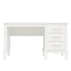 Het bureau Elena van Bopita is uitgevoerd in een oogstrelende combinatie van wit met goudkleurige accenten. Door de sierlijke, afgeronde vormen heeft het bureau een elegante, romantische uitstraling. De drie ruime lades zijn voorzien van een verfijnde, matte goudkleurige handgreep. Het bureau is vervaardigd uit sterk MDF en is dekkend wit afgewerkt met een lak op waterbasis. Deze lak is veilig voor kinderen en milieuvriendelijk. Het hout van dit bureau is afkomstig uit Europese bossen. Dit bureau is een ideale plek om lekker te knutselen of om huiswerk aan te maken. Voor een elegante, romantische kinderkamer combineer je dit bureau Elena met de andere meubels van dezelfde serie.