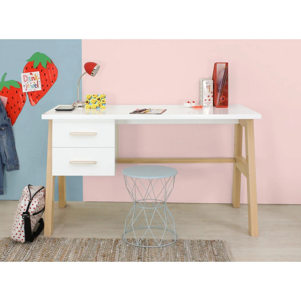 Dit bureau Lisa is ideaal voor het maken van huiswerk. Of voor knutselen natuurlijk! het bureau heeft een eigentijdse uitstraling door de combinatie van dekkend wit met naturel gelakte beukenhouten onderstel. In de twee lades is er veel ruimte voor het opbergen van spullen. Het ladeblok is zowel links, als rechts te plaatsen. Combineer dit bureau met de andere meubelen van de serie Lisa.