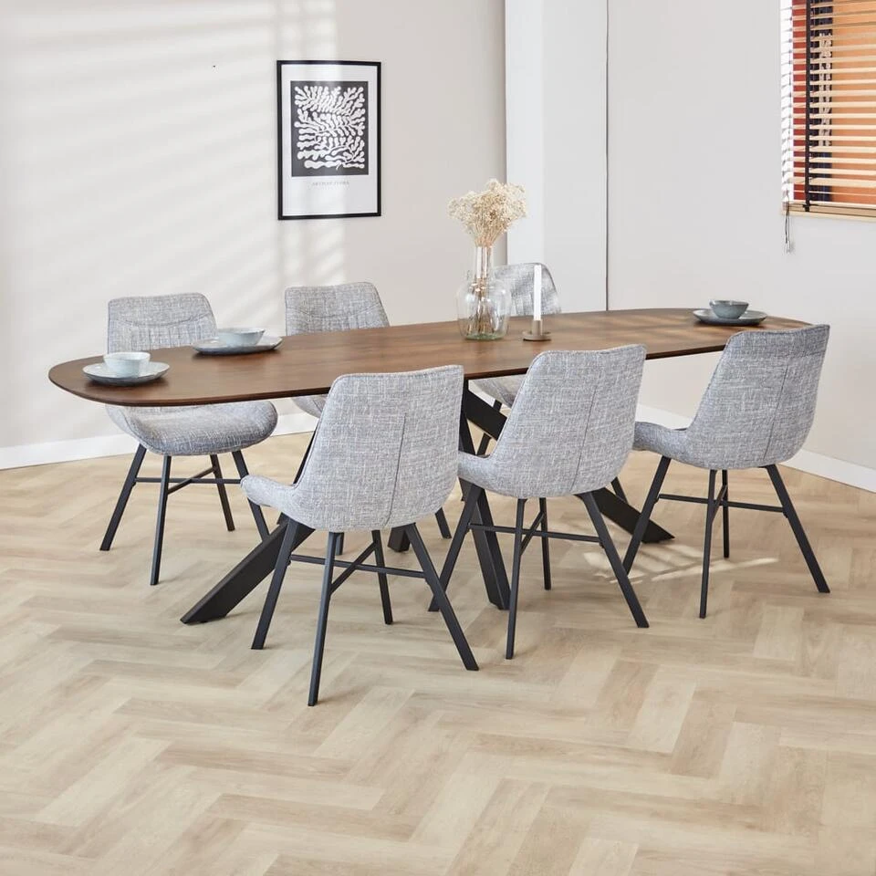 Maak kennis met onze Deens ovale eettafel Paris. Een harmonieuze mix van een Scandinavisch design en een tijdloze elegantie. Het design wordt benadrukt door de schuin aflopende rand van het blad in combinatie met het metalen onderstel. Het massieve blad van 4 cm dik is vervaardigd uit acaciahout met een warme walnoot finish. De tafel straalt een warme en uitnodigende sfeer uit in de eetruimte.Â