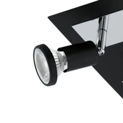 De EGLO Sarria is een spot gemaakt van staal. De spot heeft een zwart zijdeglans afwerking met spiegel details. De Sarria spotkoppen zijn gemakkelijk kantelbaar. Deze spot met GU10 fitting wordt geleverd inclusief LED lichtbronnen en is geschikt voor een maximaal wattage van 4X5W. De lamp geeft warm wit licht (3000K) en is niet dimbaar. Door het moderne design past de Sarria spot goed in en modern interieur.