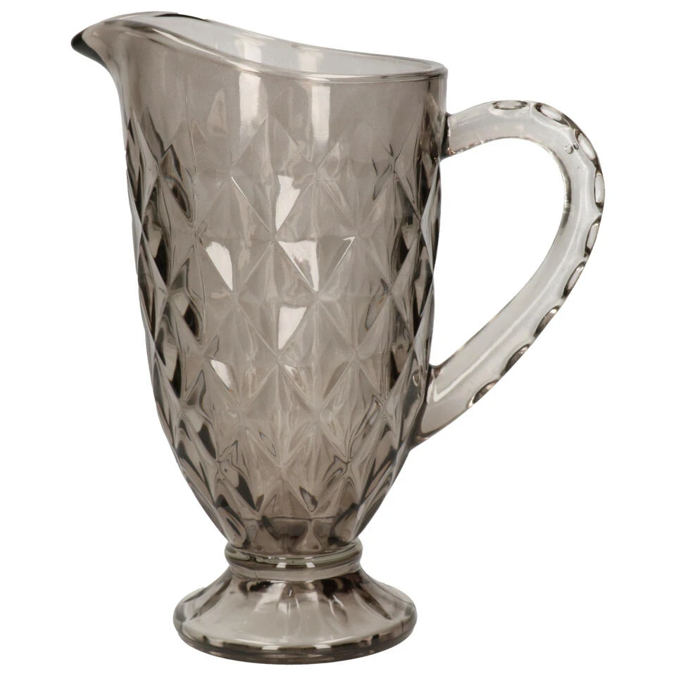 Complete set bestaande uit een karaf/schenkkan 1 liter en 6 drinkglazen 250 ml grijs. Materiaal: glas. Afmeting karaf: 14 x 21 cm. Afmeting drinkglazen: 14 x 7 cm.