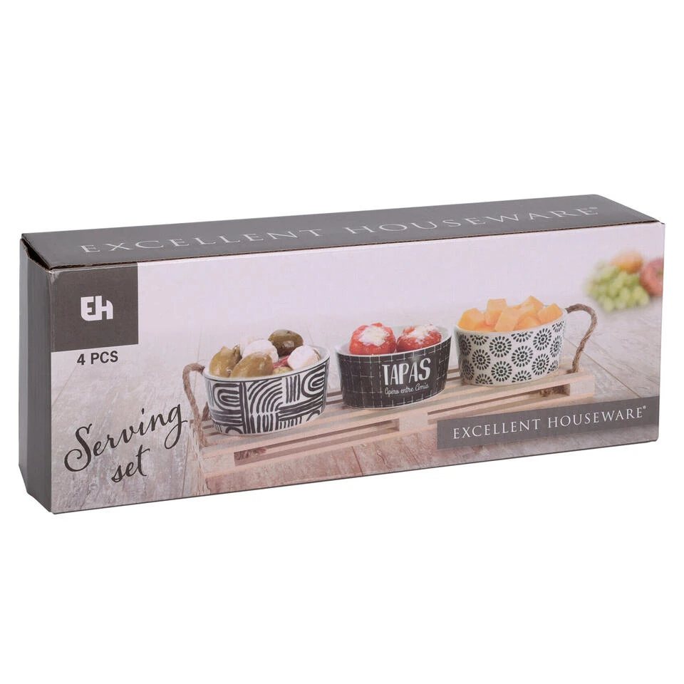 Excellent Houseware Serveerplank hout 23 x 9 cm met 3x hapjes/saus/tapas porselein schaaltjes. De zwart/witte schaaltjes zijn ongeveer 8.5 cm breed en 4 cm hoog. Serveer uw gerechten met deze mooie set tijdens diner of borrel. Schaaltjes zijn geschikt voor in de vaatwasser, de houten serveerplank echter niet. Rechthoekige serveerset.
