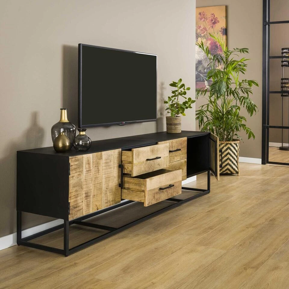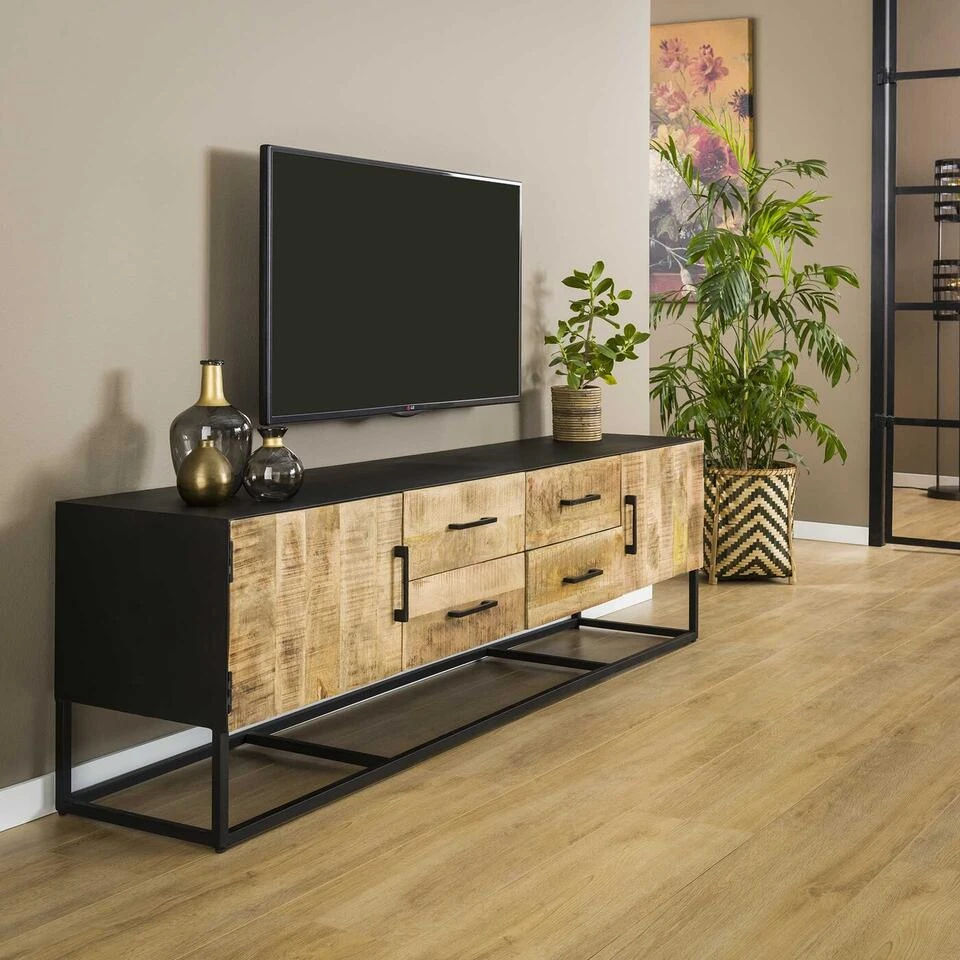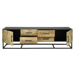 Dit TV-meubel ‘metal wood’ is uitgevoerd in mangohout met metaal. Deze combinatie geeft een stoer en eigentijds karakter aan het meubel. Dit TV-meubel is voorzien van vier lades en twee deuren. Het TV-meubel bestaat er ook in een kleinere variant. Dit TV-meubel maakt deel uit van de ‘metal wood’ serie.