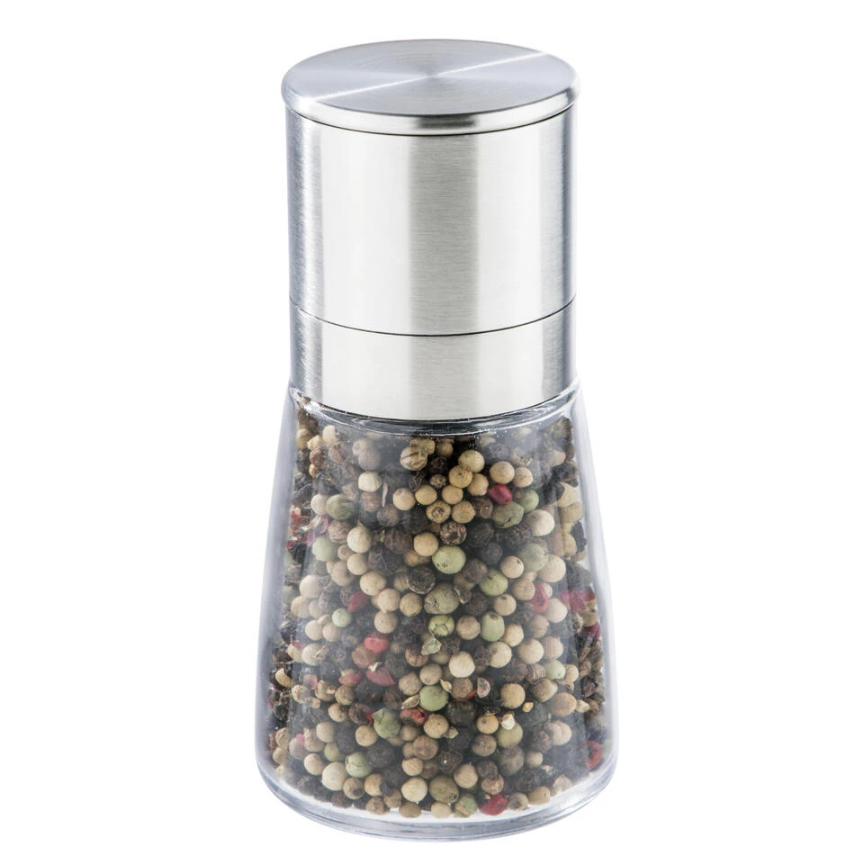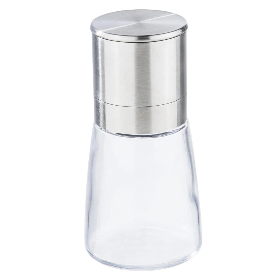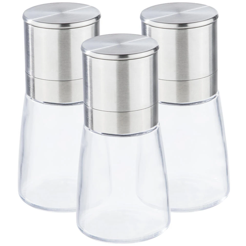 Set van 3x stuks kruidenmolen/pepermolen/zoutmolen RVS/glas transparant/zilver 13 cm. Geschikt voor het malen van diverse kruiden/specerijen, peper en zout. Je kunt het maalgraad aanpassen van fijn tot grof. Formaat: ca. diameter 6 cm x lengte 13 cm. Materiaal: RVS, glas.
