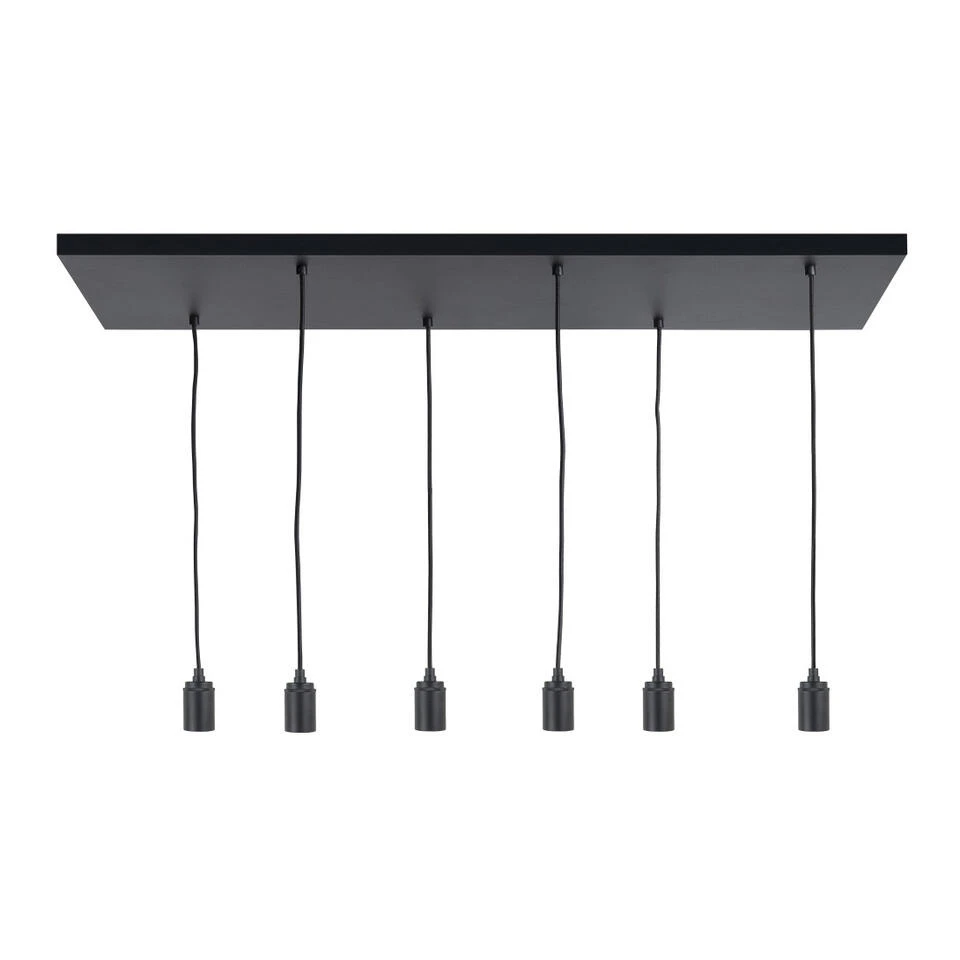 Deze grote plafondplaat van leverancier Highlight is voorzien van 6x stoffen snoeren met aan het uiteinde gladde E27 fittingen. De hoogte van de snoeren is uiteraard in te stellen en is maximaal 130 cm, de plafondplaat heeft een lengte van 100 cm en een breedte van 35 cm. Kleur: zwart.