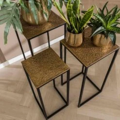 De Inez serie van het woonmerk Fraaai bestaat uit diverse leuke meubels gemaakt van metaal. Alle items zijn afgewerkt in het ‘metallic’ antiek brons. Dit geeft de serie een unieke en bijzondere uitstraling. De plantentafel/bloemenzuil set van 3 bestaat uit drie vierkante tafels met diverse afmetingen. De zuilen zijn niet allemaal even hoog wat zorgt voor een speels effect. De zuilen zijn overigens multi inzetbaar; zet ze bij elkaar en geniet van de eenheid of zet ze gespreid in het huis. De afmetingen zijn: B: 35 cm, D: 35 cm, H: 70 cm / B: 30 cm, D: 30 cm, H: 65 cm / B: 25 cm, D: 25 cm, H: 60 cm. Het blad van de tafels zorgt voor een gave uitstraling. Combineer Inez plantenzuilen set met de andere meubels uit deze collectie voor eenheid binnen het interieur. De Inez serie bestaat uit: een laptoptafel, haltafel, salontafel set van 4, salontafel set van 2 en een bloemenzuil set van 3.