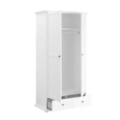 Kledingkast Margaux wordt gekenmerkt door een tijdloze elegantie. De kast is gemaakt van spaanplaat en heeft 2 deuren en 2 lades met metalen geleiders. Achter de twee deuren vind je een kledingroede en een plank. Voldoende ruimte dus voor al je kleding. Ondergoed, t-shirts en sokken berg je op in de ruime lades.