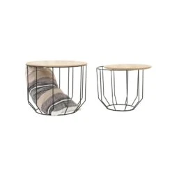 Gemaakt van duurzaam metaal en hout, is deze tweedelige set van industriële bijzettafels zowel stevig als modern. De grote bijzettafel heeft een diameter van Ø50 x 40 cm, terwijl de kleine bijzettafel een diameter heeft van Ø40 x 36 cm. Beide tafels hebben een afneembaar tafelblad voor extra gemak.