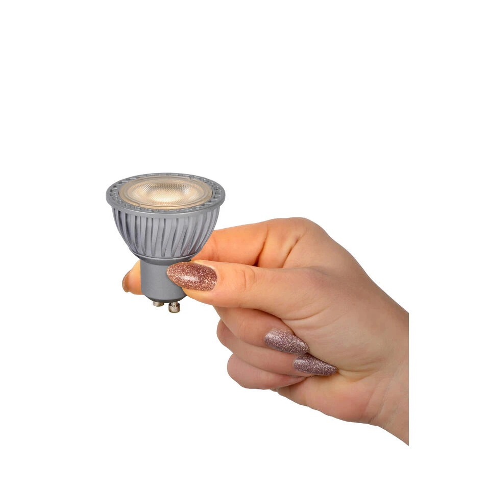 Houd je licht strak in het pak met deze stijlvolle ledlamp. De kunststof behuizing is uitgewerkt met groeven rondom het licht en eindigt in een platte raster aan de kop van de spot. Dankzij zijn extra warm wit licht van 2200K is de LED Bulb spot veelzijdig in gebruik. Bovendien is de lichtbron dimbaar in drie stappen. Met een diameter van 5 centimeter levert deze ledlamp een lichtopbrengst van 350 lumen.