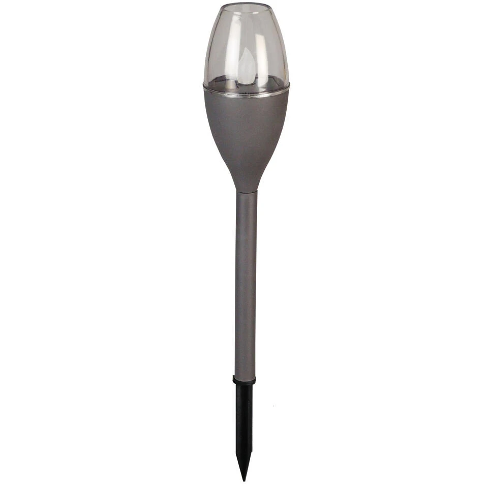 1x Solar tuinlamp met Flame effect LED verlichting voor in de tuin. De milieuvriendelijke LED tuinfakkel heeft 1 LED lamp per lamp en werkt op zonne-energie waardoor deze zichzelf opladen gedurende de dag, als de lamp volledig is opgeladen heeft deze ongeveer 6 branduren. Deze lamp is uitgevoerd met steker waardoor de lamp gemakkelijk in de aarde te prikken/steken is. Schakelaar: ja. Kleur licht: Flame effect. Kleur: grijs. Afmeting: D6,2 x H38 cm. Solar paneel: 2V 40 mA. Batterij: 1 x 1.2V AAA 200 mAh (oplaadbaar). Materiaal: kunststof. Tuinlampen/tuinverlichting/prikspots op zonne-energie.