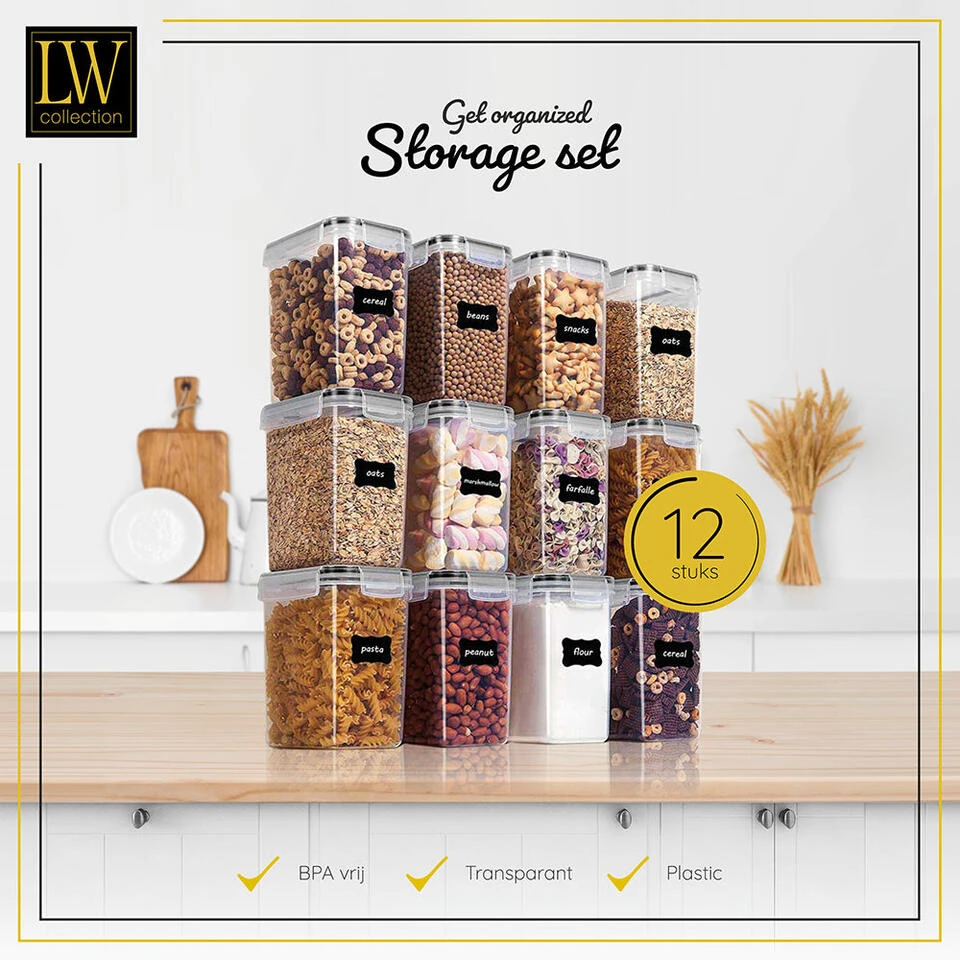 Breng meer orde en structuur in je keuken met deze transparante hoogwaardige voorraadpotten. Deze set bestaat uit maar liefst 12 stuks om al je voorraad netjes in te kunnen bewaren. De potten zijn 100% luchtdicht en lekvrij. Je krijgt er een stickervel en pen bij zodat je kunt opschrijven wat er in de potten zit.Â