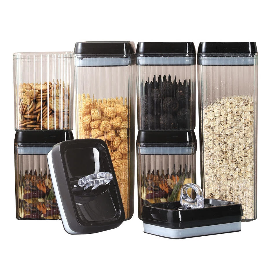 Breng meer orde en structuur in je keuken met deze set van 6 voorraadpotten met zwarte deksel. De set bestaat uit potten van verschillende afmetingen. De potten zijn gemaakt van kunststof en zijn BPA vrij.