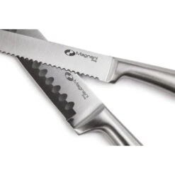 Verder zijn de Magnani messen handgemaakt en gesmeed uit hoogwaardig RVS. Hierdoor liggen ze lekker in de hand en blijft voedesel niet kleven. Door de unieke legering van gehard staal, zijn de messen ijzersterk en slijtvast.