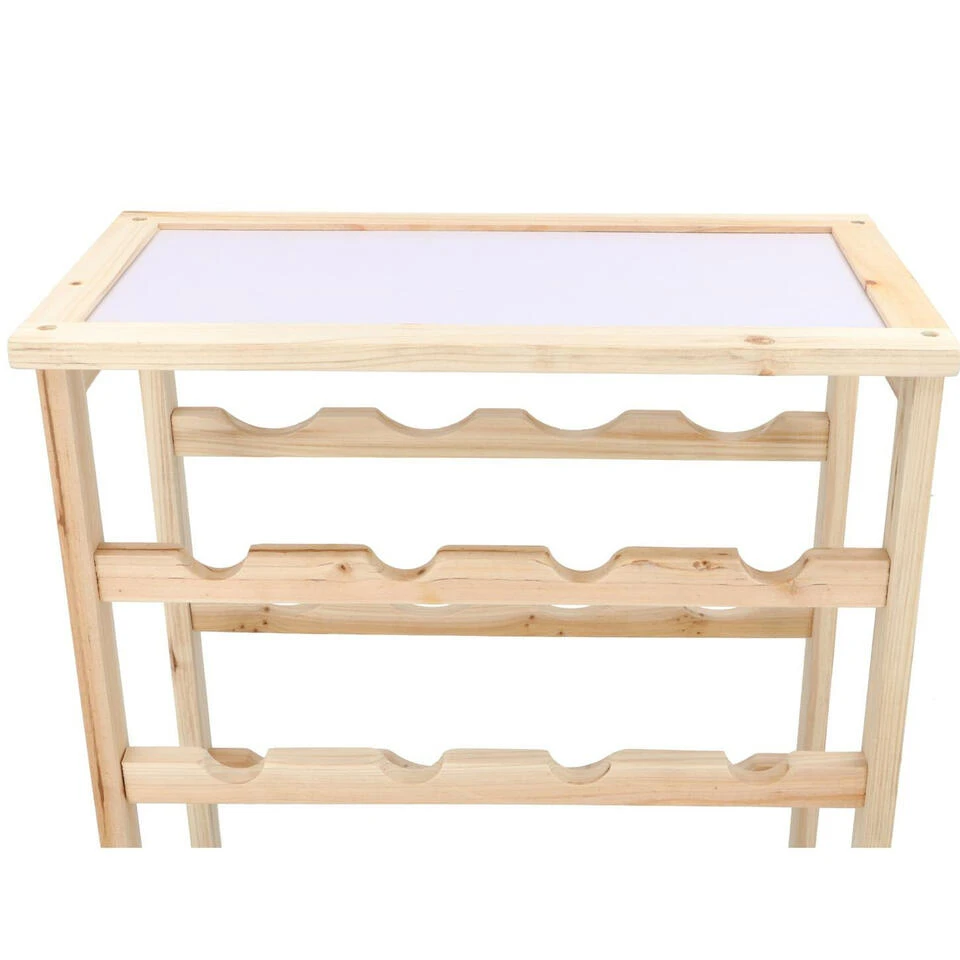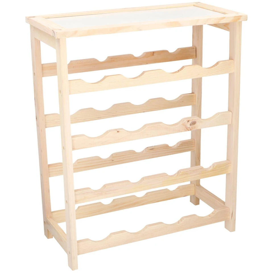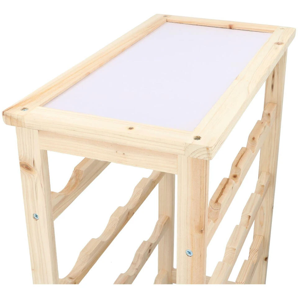 Een wijnrek/wijnflessenrek/wijnkist, met ruimte voor 16 flessen. Het rek heeft een blad/plank/tafeltje aan de bovenkant zodat u er bijvoorbeeld glazen op kunt zetten. Afmeting: circa L46 x B23 x H55 cm. Materiaal: hout.