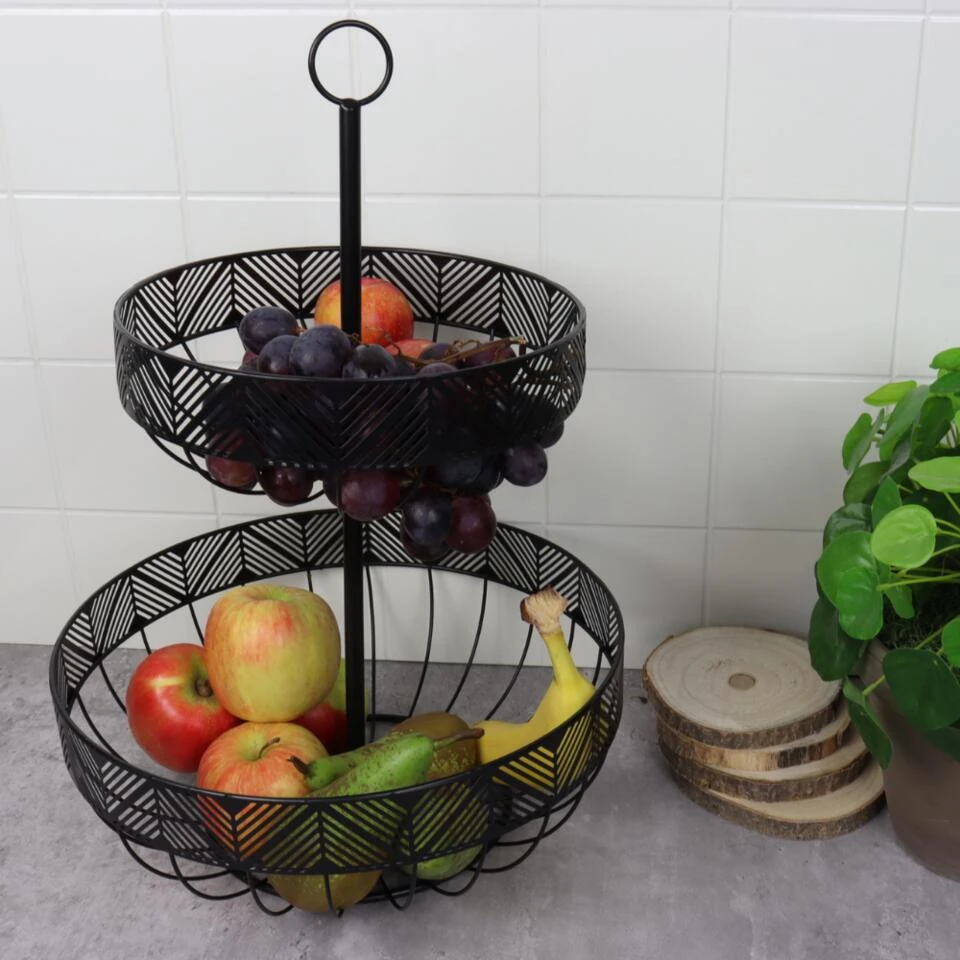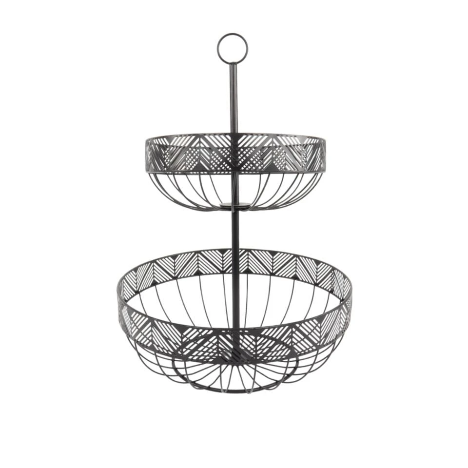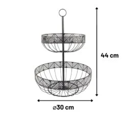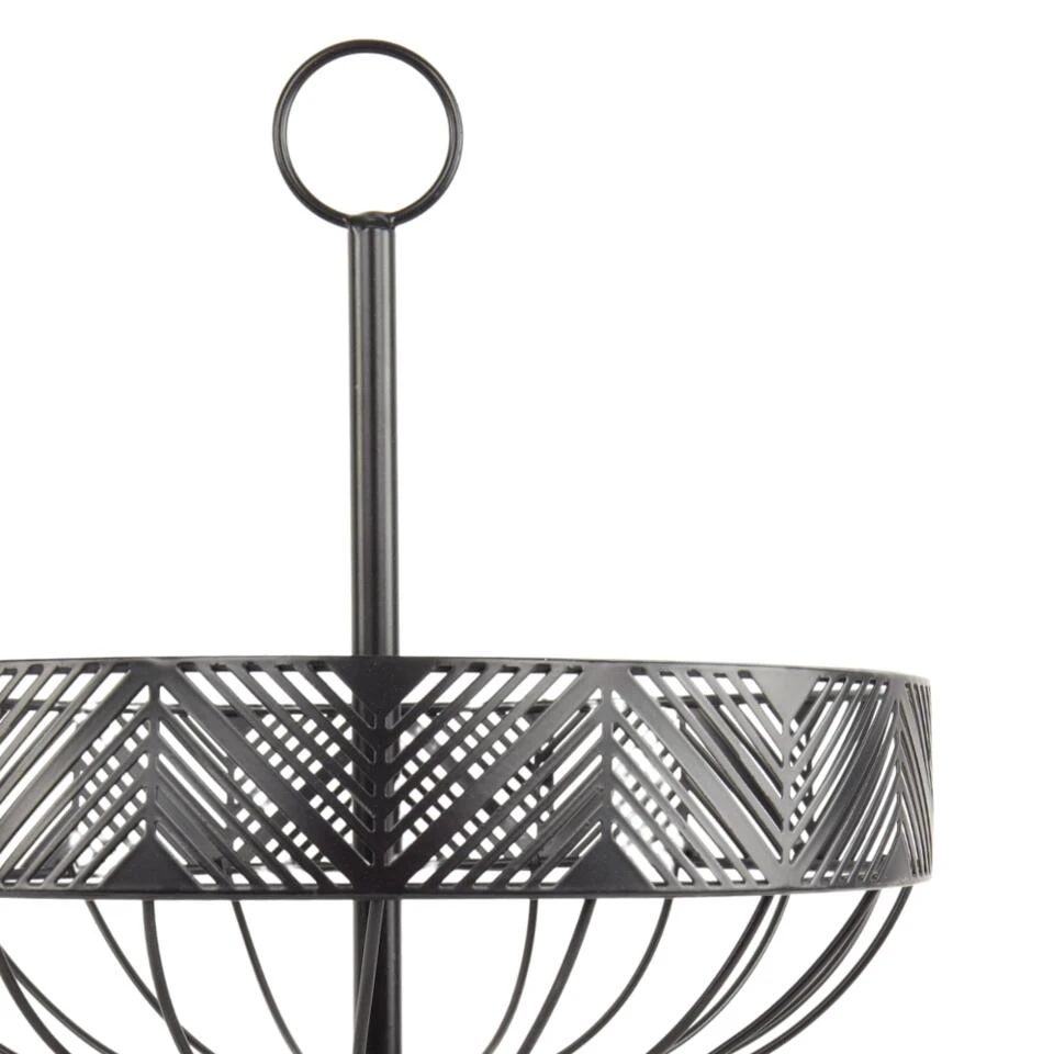 De fruitmand etagère van Orange85 is voorzien van 2 manden. De etagère is geschikt om veel fruit in om te bergen. Het materiaal van de fruitschaal is metaal en de kleur is zwart. De bovenste mand heeft een diameter van 23cm en de onderste een diameter van 30cm. De hoogte van de fruitmand etagère is 44 cm.Â