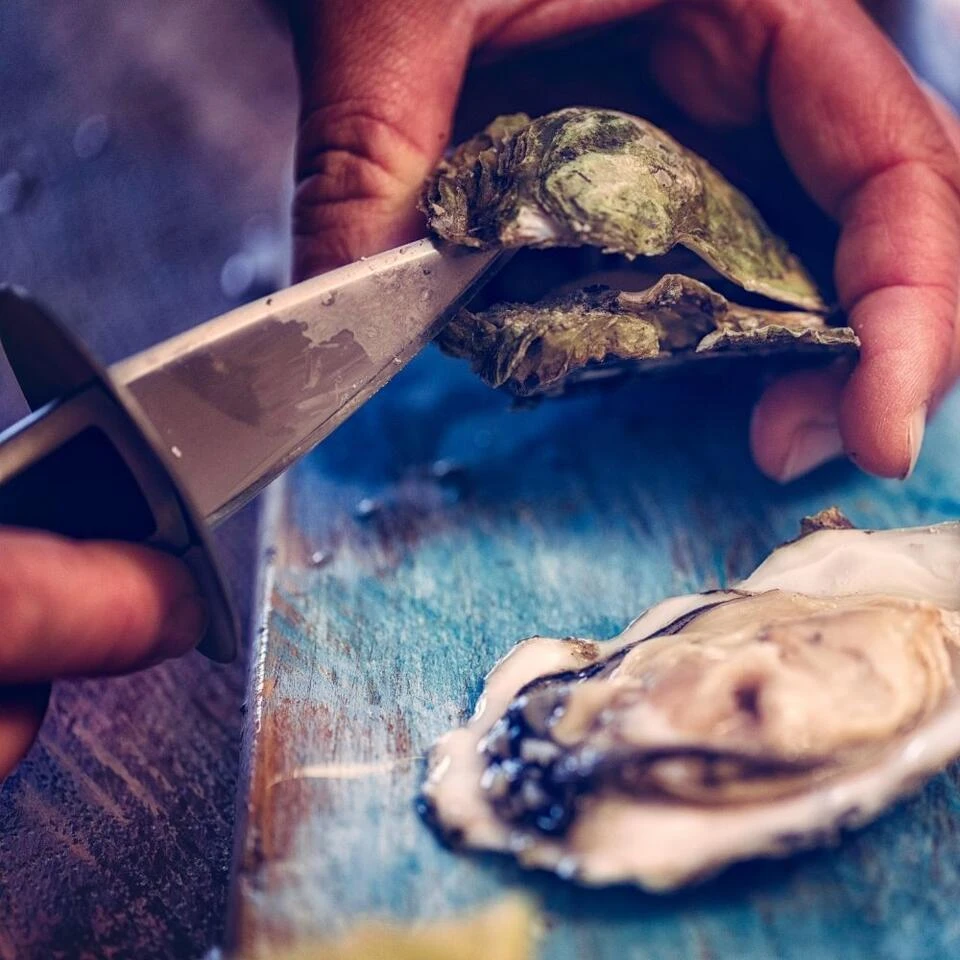 Oestermes met siliconen hulpmiddel van Orange85. Het mes is ideaal om oesters gemakkelijk open te breken en is gemaakt van RVS. De set wordt geleverd met siliconen hulpmiddel om de oester in te klemmen.