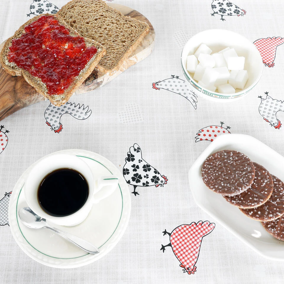 Wil jij jouw interieur aankleden en daarbij je tafelblad beschermen tegen krassen en vlekken? Dat kan met dit speelse tafelkleed. De print van kippen geeft je interieur een gezellige uitstraling.Â
