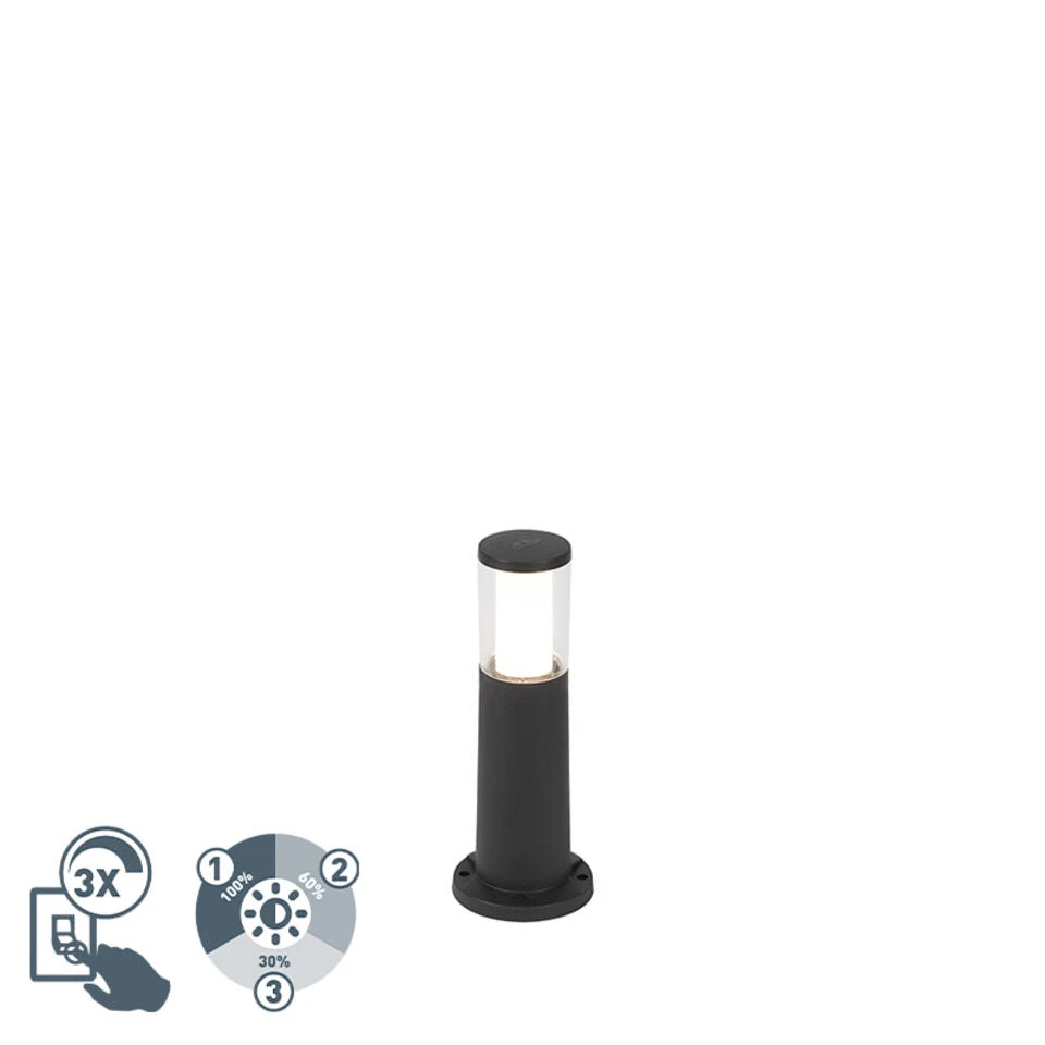 Klein maar fijn! Deze zwarte buitenpaal Carlo uit kunststof is een streling voor het oog. Doordat ze zo klein (40 cm) zijn is het ook leuk om enkele kleine lampjes naast elkaar in de tuin te hebben om nog een extra lichteffect te krijgen. De lamp wordt geleverd met een 3-staps dimbare LED GU10 lichtbron van 3 Watt met maximaal 400 lumen. Deze kun je door snel achter elkaar op de wandschakelaar te drukken instellen op 100%, 60% en 30% lichtsterkte. Daarbij dimt de lichtbron ook in kelvin van 6500, naar 4000, naar 3000 Kelvin. De lichtkleur wordt dus steeds warmer. De Carlo heeft een hoogte van 40 cm en een diameter van 9,5 cm. Hij heeft IP-waarde van IP55 waardoor hij goed beschermd buiten staat. Een echte aanwinst in de tuin, deze Carlo.
