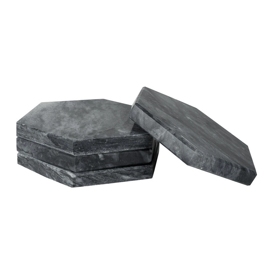 De onderleggers zijn gemaakt van marmer en hebben daarmee een chique uitstraling. Het marmer van de onderzetter set van vier is natuurlijk, verfijnd en gepolijst. De onderleggers zijn zeshoekig en hebben de kleur antraciet.