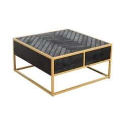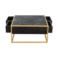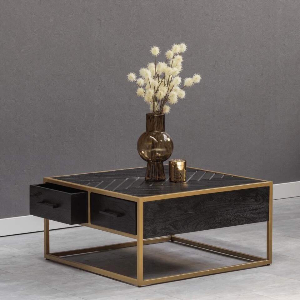 Deze stoere mangohouten salontafel Napels krijgt door zijn visgraatmotief en goudkleurige accenten een uniek, chique karakter. De tafel biedt ook nog voldoende opbergmogelijkheden voor bijvoorbeeld de afstandsbediening door de twee diepe lades. Het goudkleurige metalen frame en de zwarte houten delen vormen een stoere basis voor ieder interieur.