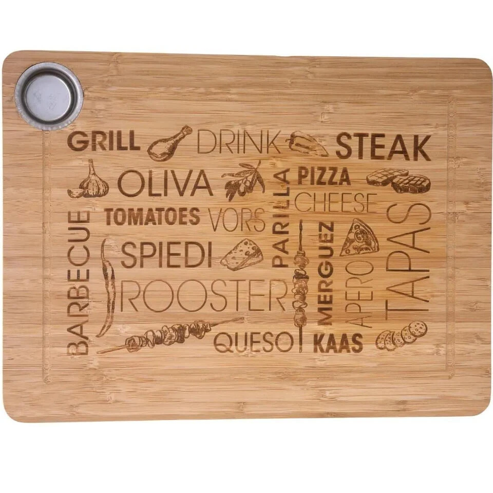 Tapas serveerplank rechthoek 38 x 28 cm van bamboe hout. Stevige houten plank met sapgroef en opvangbakje, de achterkant van de plank is blanco. Om de kwaliteit van de plank te behouden, is het aan te raden deze af en toe in te wrijven met een beetje plantaardige olie. Afmeting: ca. 38 x 28 x 2 cm. Materiaal: bamboe hout. Reinigen: hand afwas met een klein beetje mild afwasmiddel.