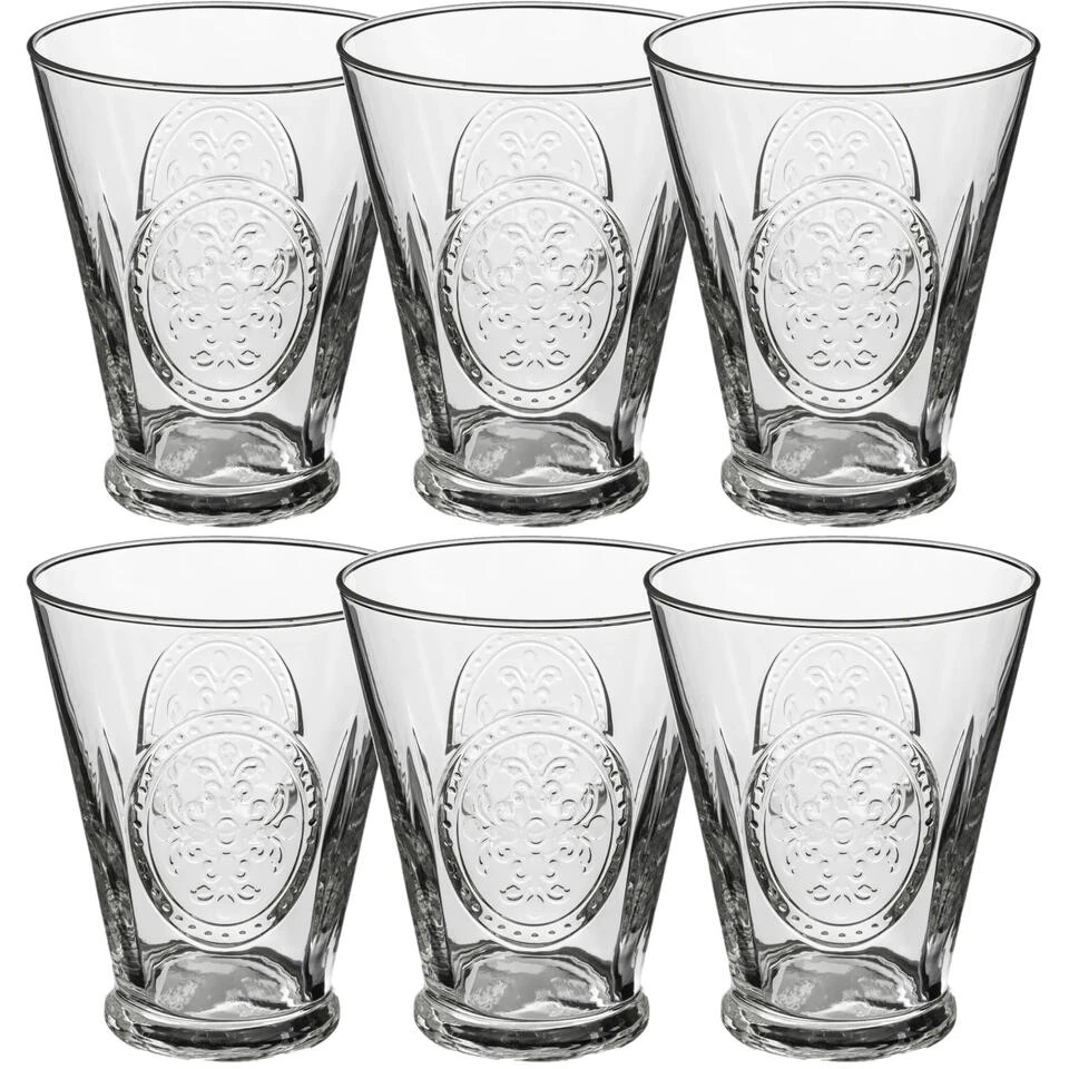 Set van 6x stuks tumbler glazen 340 ml. Afmeting: ca. D9 x 11 cm, diameter bovenkant ca. 5 cm. Inhoud: ca. 340 ml/34 cl. Gewicht per glas: ca. 240 gram. Materiaal: glas. Reinigen: vaatwasser geschikt. Serie: Carmela.