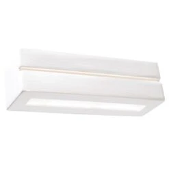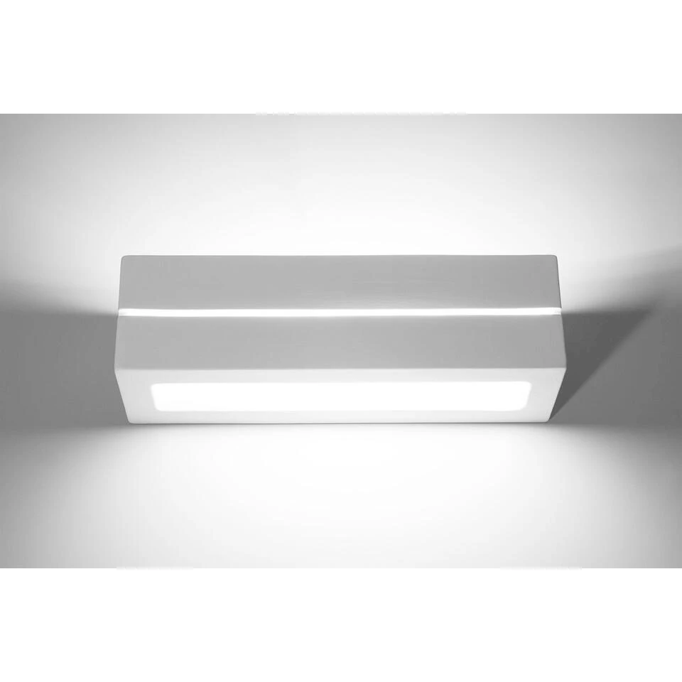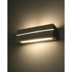 Deze strakke moderne Vega wandlamp is geschikt voor 1x E27 lichtbron van maximaal 15 Watt (Excl.) en deze geeft “up en down” licht. Ook “ontsnapt” er licht door de horizontale kier aan de voorkant. De hoogte is 9,5 cm en de breedte is 32,5 cm, de totale diepte is 9,5 cm. Deze sierlijke wandlamp is gemaakt van wit gips (overschilderbaar) en wordt geleverd zonder aansluitsnoer. Aan de onderzijde bevindt zich een matte glasplaat. 5 jaar garantie.