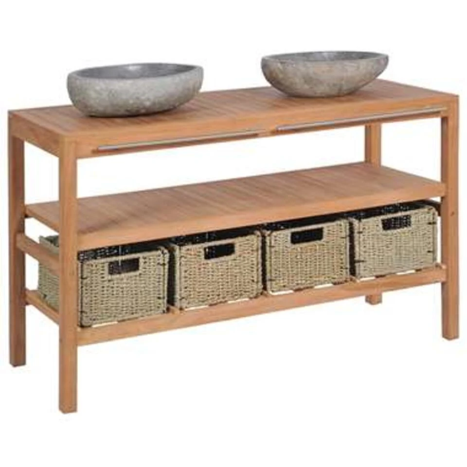 De wastafelkast is gemaakt van massief teakhout dat duurzaam genoeg is om 2 wasbakken en andere badkameraccessoires op te plaatsen. Het badkamermeubel heeft 2 handrails voor het ophangen van handdoeken en kleding. De 4 manden laten je badkamer er netjes en geordend uitzien. De kast heeft 4 steunpoten om stabiliteit en droogte boven de grond te garanderen. De kast past perfect onder je gootsteen en maakt opbergen heel makkelijk.