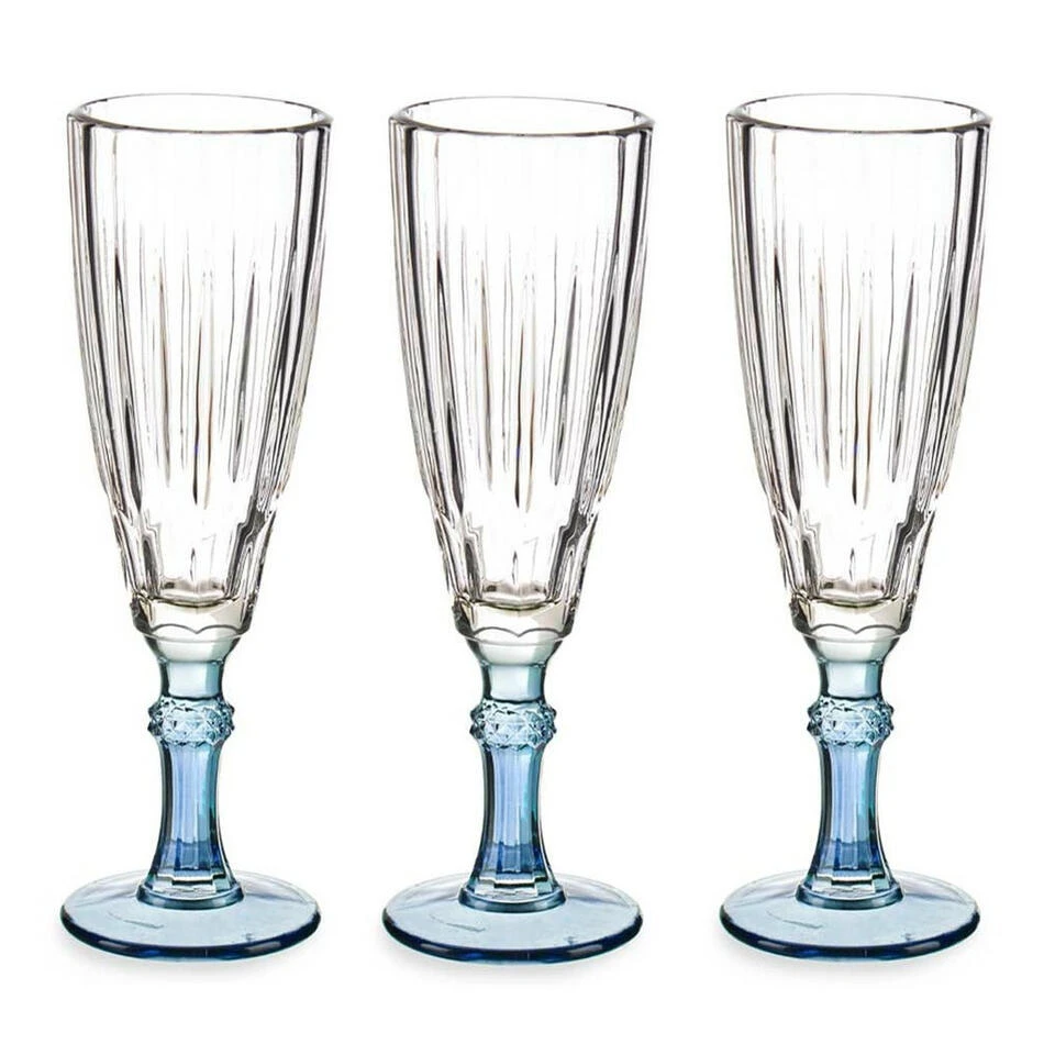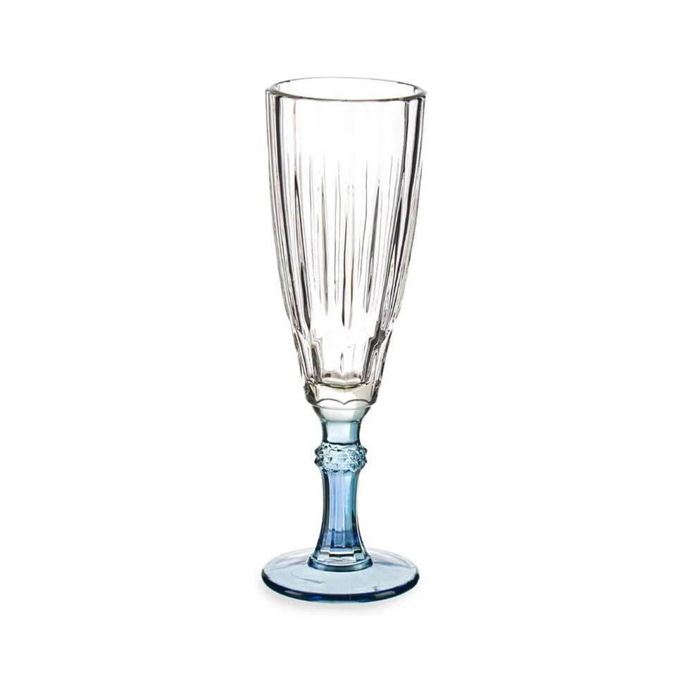 Luxe Exotic Collection Cava of Champagneglazen set van 6x stuks op blauw gekleurde voet 170 ml. Prachtige luxe uitstraling glazen collectie van Vivalto. De voet is licht blauw gekleurd in het glaswerk, de bovenzijde is transparant. Formaat per glas 6.5 x 20 cm. Gemaakt van kristal. Niet geschikt voor in de vaatwasser.