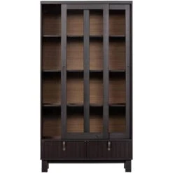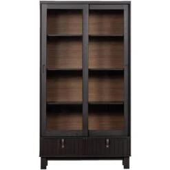 Woood vitrinekast Hux is gemaakt van bruinzwart gelakt grenenhout. Deze kast heeft een stoere uitstraling en een moderne look. De kast heeft een afmeting van 200x108x44 cm. Met twee lades en 3 planken biedt deze kast voldoende ruimte voor bijvoorbeeld boeken, servies en woonaccessoires. Door zijn stoere uitstraling en het gebruik van latjes sluit hij helemaal aan bij de laatste trends!